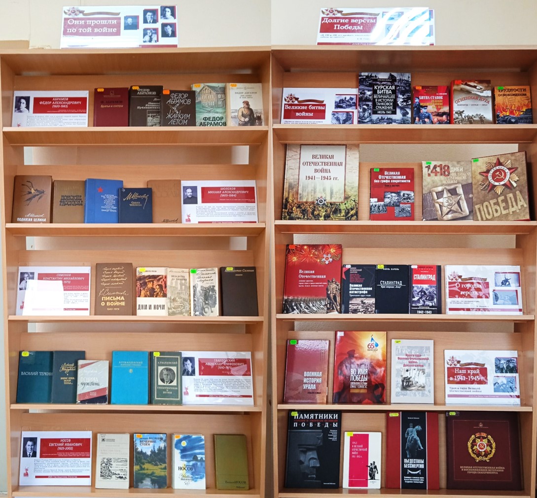 Книжно-литературная экспозиция «Они прошли по той войне. Писатели-фронтовики – юбилейные даты 2025 года» и тематическая выставка изданий «Долгие версты Победы» о значимых битвах Великой Отечественной войны; Городах-Героях; жизни Урала в 1941-1945 гг. размещены в Электронном читальном зале, составитель Ю.В. Хорошайлова.