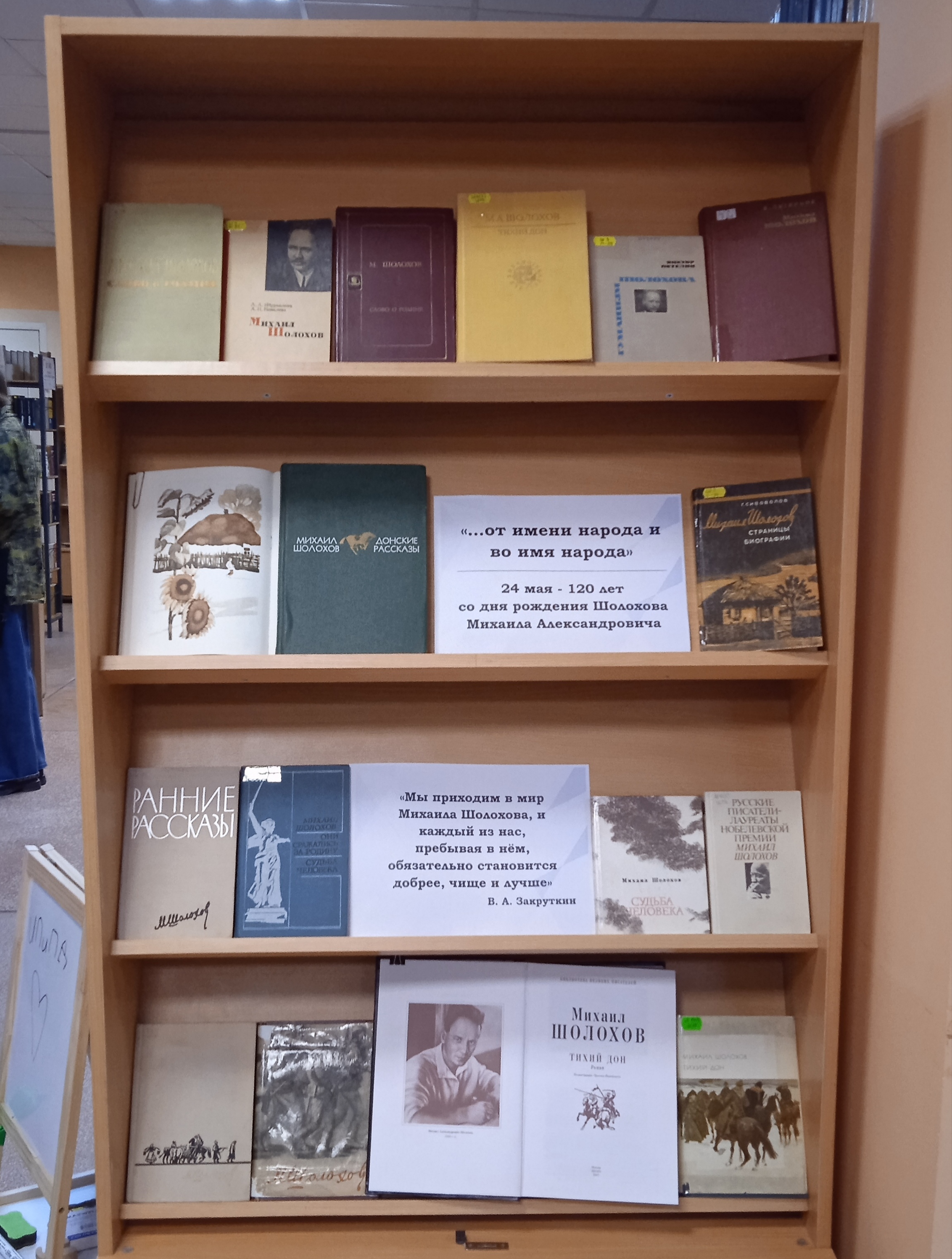 Выставка-творческий портрет к 120-летию со дня рождения писателя-фронтовика М.А. Шолохова, составитель Н.В. Косинова.