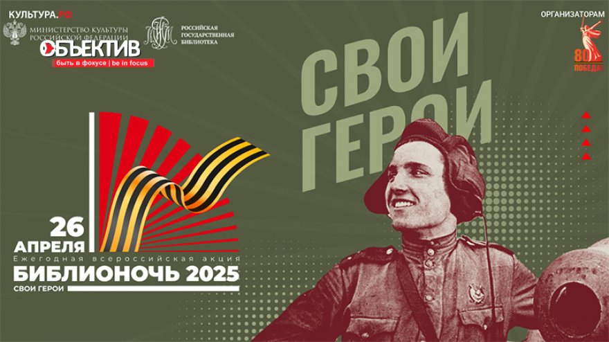 26 апреля стартует всероссийская ежегодная читательская акция «Библионочь» с единой темой «Свои герои» в год 80-летия Победы в Великой Отечественной войне под девизом «Нет в России семьи такой, где б не памятен был свой герой». Библиотеки по всей стране превратятся в площадки памяти и почитания героев. Организаторы акции – Министерство культуры РФ, РГБ и портал «Культура.РФ».