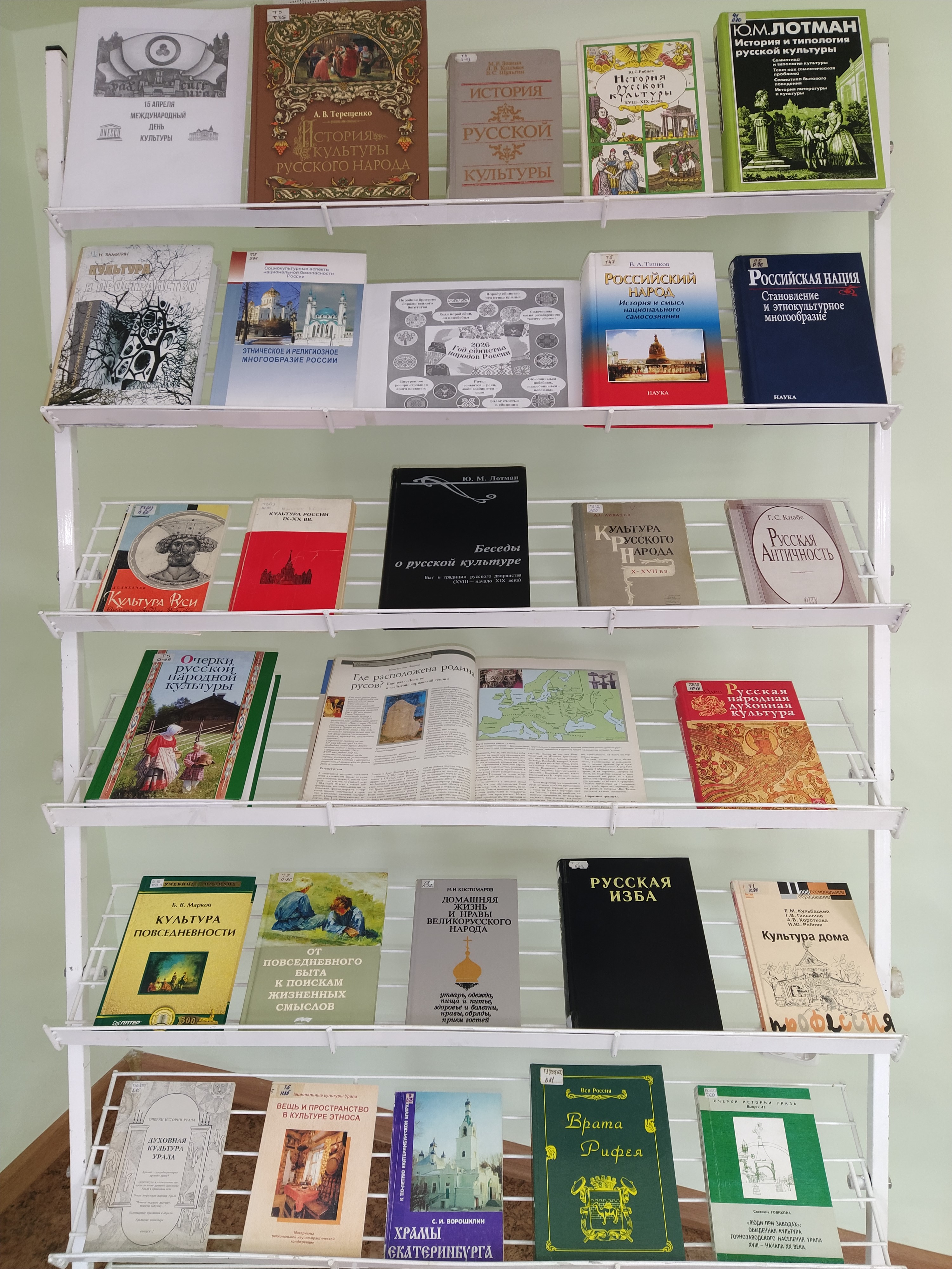 Книжная выставка к этому Дню в Научной библиотеке посвящена культурному наследию России, на ней представлены издания по истории русской культуры: этнографические очерки по традиционной культуре русского народа в различные периоды исторического развития, исследование жизни русского дворянства – «Беседы о русской культуре. Быт и традиции русского дворянства. XVIII – начало XIX века» культуролога Ю. Лотмана и другие.