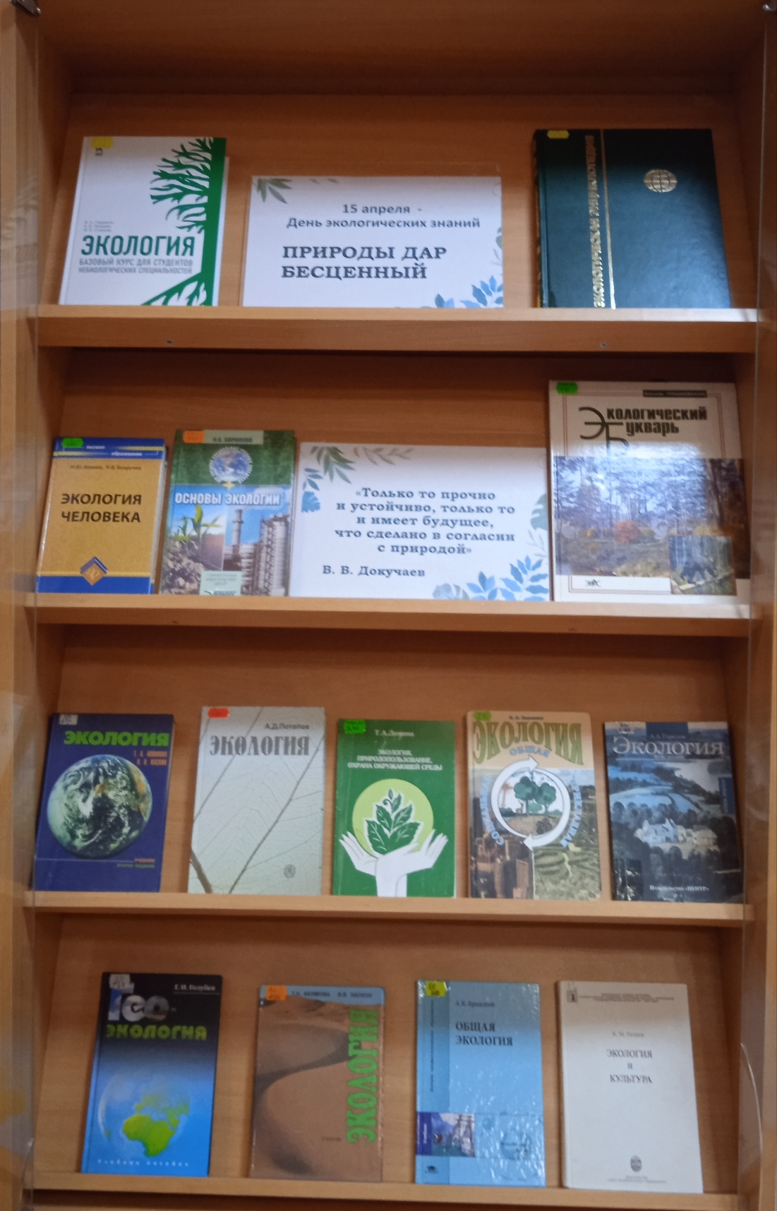 К Дню экологических знаний (отмечается ежегодно 15 апреля в России и мире в отношении к природе и вообще среде обитания всего живого) вниманию читателей представлена выставка изданий эколого-образовательного характера (ГУК, зал абонемента, экспозиция до 25 апреля).