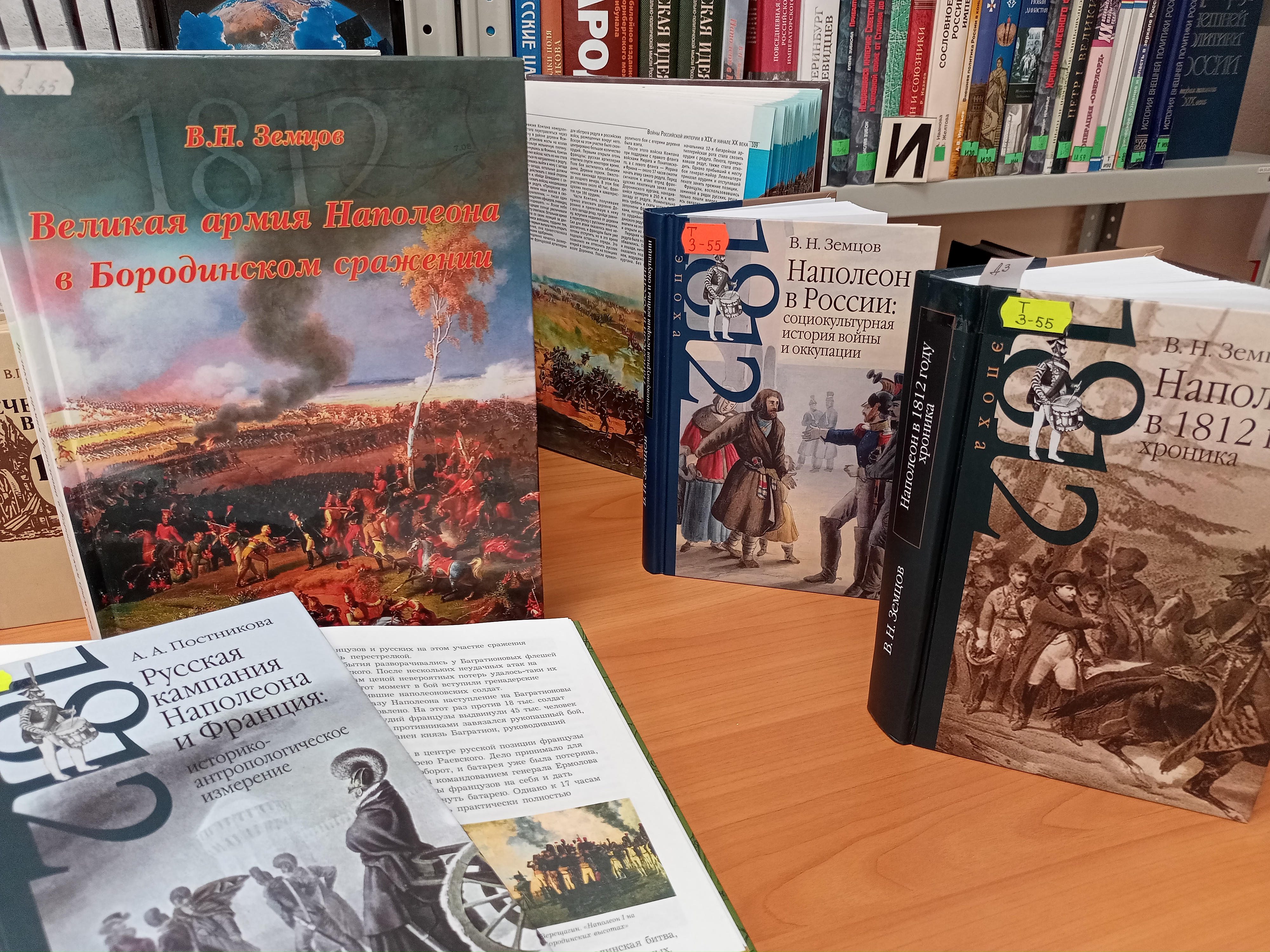 На выставке представлены уникальные книги В. Н. Земцова, отражающие современные исследования этого периода истории России в серии «Эпоха 1812 года». Это монография «Наполеон в Москве» (2014); монография «Великая армия Наполеона в Бородинском сражении» (2018), которая позволяет взглянуть на Бородинское сражение глазами противников русских войск. Эта фундаментальная работа на основе широкого комплекса источников тщательно реконструирует действия Великой армии Наполеона в ключевые моменты величайшей битвы, впервые в подробностях восстанавливает механизмы функционирования этой сложнейшей военной машины в 1812 году, отвечая на самые спорные вопросы. Книга «Наполеон в России: социокультурная история войны и оккупации» (2018) на основе широкого круга отечественных и зарубежных источников представляет особенности межкультурных контактов в эпоху Отечественной войны 1812 г. (Русской кампании Наполеона).