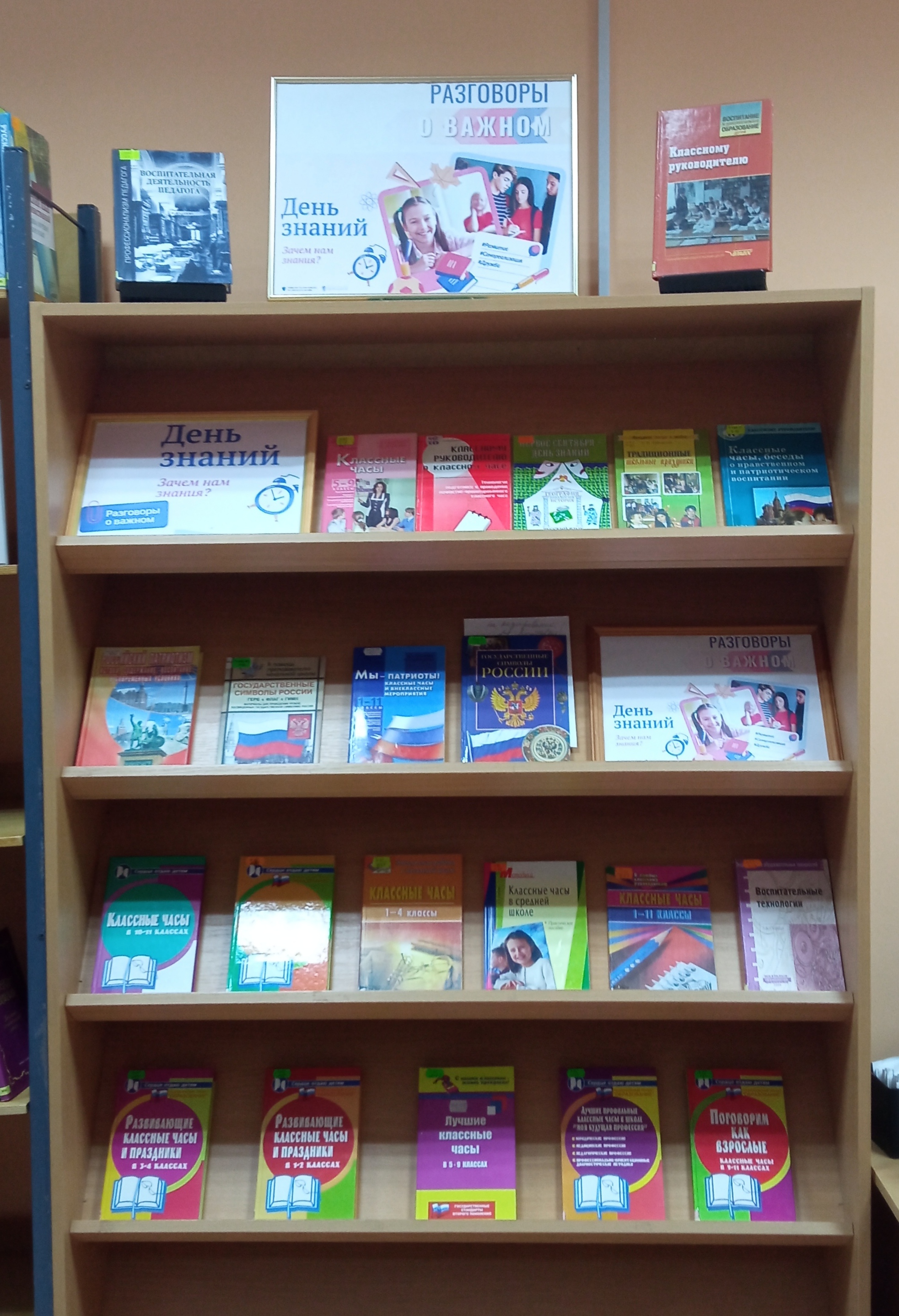 Книжная методическая выставка «Разговоры о важном. День знаний» в Научной библиотеке (ГУК, Отдел обслуживания, 1 этаж) открыта с 23 августа, составитель Наталья Владимировна Косинова. Экспозиция изданий поможет классному руководителю подобрать педагогическую литературу по методике организация классных часов в начальной и старшей школе. Основная идея выставки и подборки рекомендованных библиотекой книг: «Разговоры о важном» – это нестандартный урок с гибкой формой воспитательного взаимодействия, которая позволяет учитывать возрастные особенности учеников и обсуждать актуальные жизненные проблемы. Читателям предложены издания с лучшими разработками бесед на нравственные и патриотические темы, качественные сценарии внеурочных занятий. Представлены практические пособия «Классные часы» серии «Сердце отдаю детям», «Внеклассные мероприятия по гуманитарно-правовому воспитанию. 5-10 классы. Классные часы, проекты, диспуты, игры, тесты, викторины» и другие.