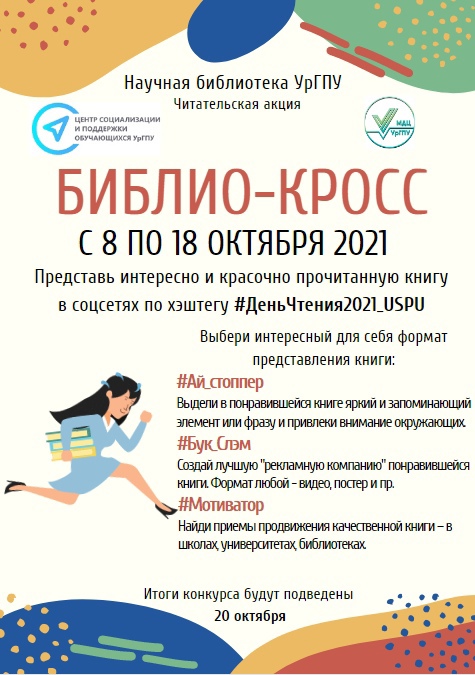 «Пробежав» интеллектуальный БИБЛИО-КРОСС, с 8 по 18 октября активные читатели размещали авторские материалы в соцсети ВКонтакте: #деньчтения 2021.uspu для того, чтобы показать, как с помощью творческих приемов можно интересно и красочно представить прочитанную книгу, привлечь детей и подростков к чтению художественной литературы.
