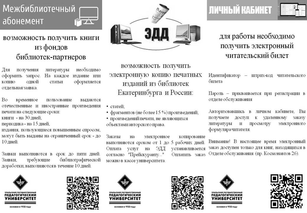МБА: межбиблиотечный абонемент – возможность получить книги из фондов библиотек-партнеров. Для получения литературы необходимо заполнить заявку на сайте (Библиотека → Услуги → МБА → Заявка). ЭДД: электронная доставка документов – возможность получить электронную копию печатных изданий из библиотек Екатеринбурга и России. Читатель оформляет запрос на электронное копирование на сайте (Библиотека → Услуги → ЭДД → Заявка).
