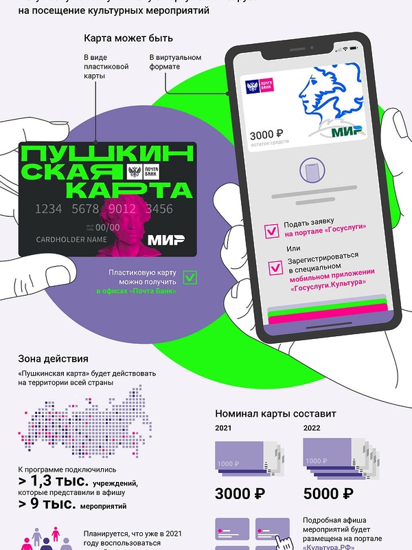 В концепции «Пушкинской карты» разъяснена механика ее регистрации и получения как в электронной версии, так и в виде пластиковой карты через портал «Госуслуги». На эту карту государство раз в год будет переводить определенную сумму для покупки билетов в учреждения культуры.